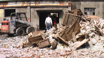 一名工人拿著水管,燒熄大批從木箱裡倒出鈔票揚起的漫天塵屑,這些鈔票塵封了半世紀多,沒想到開封後就送到焚化爐銷毀。