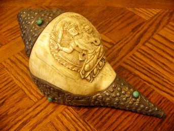 文殊菩薩法螺 在密教之中,法螺是灌頂所必須的法器之一 在《略出經》中記載,灌頂時,上師應授予商怯,告言作是,從今以後,汝應轉動諸佛之法輪,當吹無上之法螺,遍傳大法聲於一切處。《不空羂索神變真言經》第一八卷中說:“若加持螺,諸高處望,大聲吹之,四生之眾生,聞螺聲滅諸重罪,能受身舍己,等生天上。”而《千手千眼觀世音菩薩廣大圓滿無礙大悲心陀羅尼經》則說:“若為召呼一切諸天神,當用寶螺手。”表示為召集眾神的鳴示。