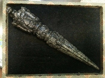 天鐵石普巴杵 手工雕刻(馬頭明王普巴杵) 長21公分 寬4公分 天鐵又稱鎳鐵隕石;化學成份:鎳與鐵,硬度:4,比重:7.87,熔點:1600—1800。據說隕石都來自外太空,在通過大氣層時表面已被高達2000攝氏度的溫度給輕微融化了,當將其切開時可以看到裡面鎳鐵組合而成的錯綜複雜交織的紋面,這是與平常的鐵的區別,當然用磁鐵也是可以將天鐵吸附的,通常天鐵表面均有細微的沙孔和黑中夾帶灰白或微黃等顏色;極象平常的鐵。 天鐵的能量勇猛剛烈,蘊藏著無與倫比的力量,密宗稱之為「天鐵」,即是「來自天上的鐵」之意,多用來製造成金剛杵、普巴杵等法器。