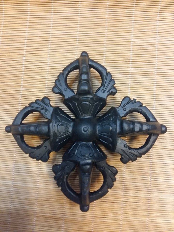 九股金剛杵 金剛杵原為印度之兵器,密教沿用之,以為智慧之幖幟,象徵能斷除煩惱,降伏惡魔,其兩端單獨者稱為獨股,分三枝者稱為三股,分五枝者,稱為五股。九股杵之形狀與五股杵相同,唯增股數,以表示中胎(臺)院之八葉九尊。其兩端有金胎兩部之九尊,表示「因果不二」之義。